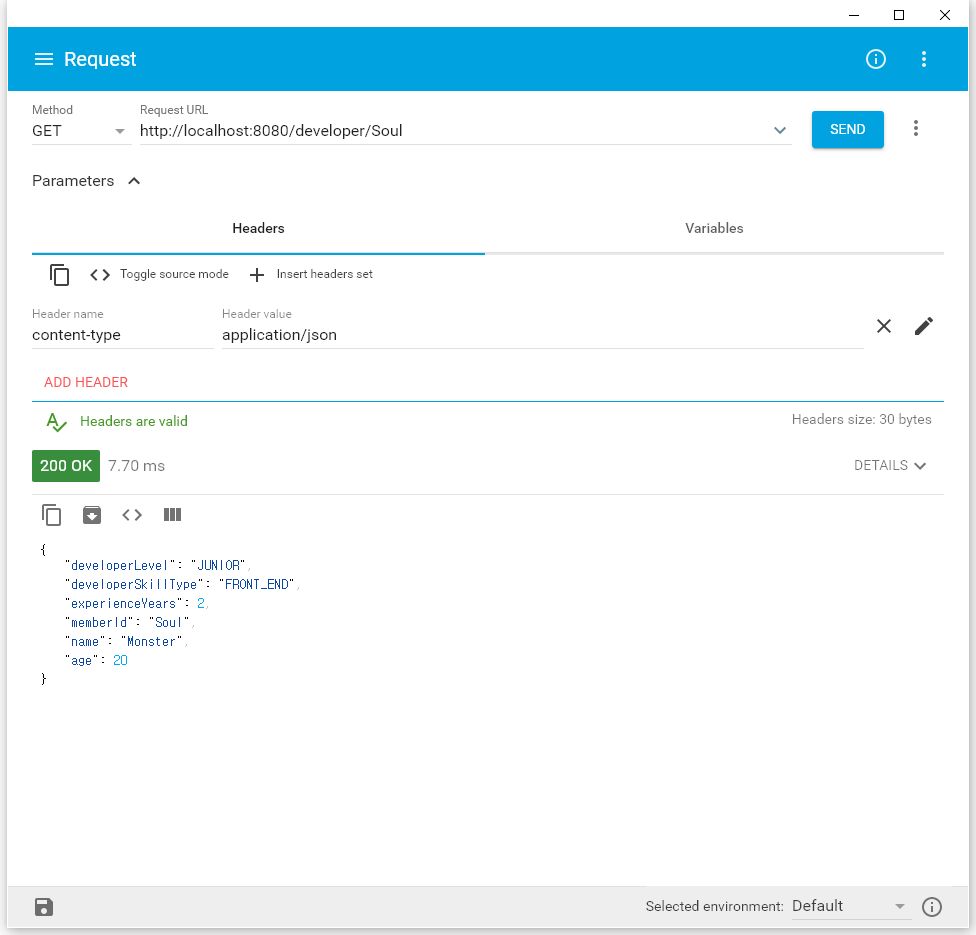 POST 요청을 통해 developer를 생성하고 GET을 통해 조회하면 아래와 같은 결과를 얻을 수 있다.