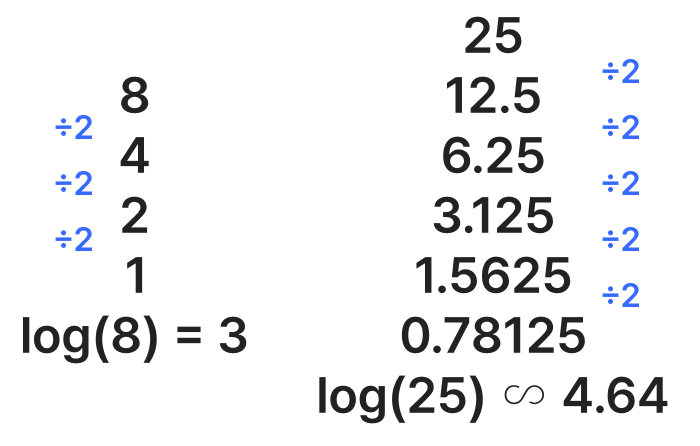 로그 함수의 간단한 규칙을 설명하면 어떤 이진 로그를 대략 계산하기 위해서는 그 숫자가 1보다 작아지기 전에 2로 나눠지는 횟수이다. 무슨 말인지 이해하기 위해 아래 그림을 보자.